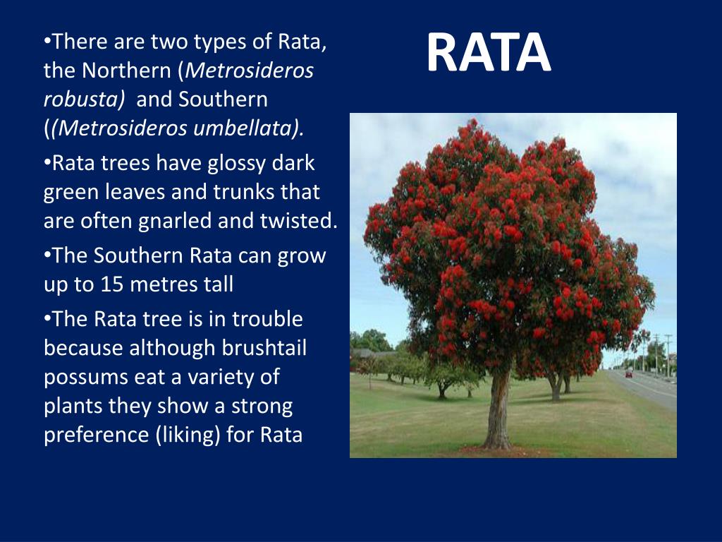 RATA There are two types of Rata, the Northern (Metrosiderosrobusta) and Southern ((Metrosiderosumbellata). Rata trees have glossy dark green leaves and trunks that are often gnarled and twisted. The Southern Rata can grow up to 15 metres tall The Rata tree is in trouble because although brushtail possums eat a variety of plants they show a strong preference (liking) for Rata