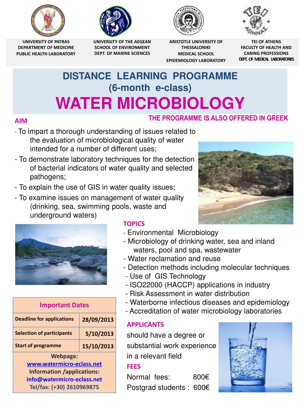 DISTANCE LEARNING PROGRAMME ( 6-month e- class ) WATER MICROBIOLOGY. THE PROGRAMME IS ALSO OFFERED IN GREEK. AIM - To impart a thorough understanding of issues related to the evaluation of microbiological quality of water intended for a number of different uses;
