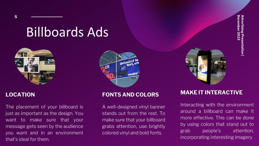 4 BE STRAIGHTFORWARD Your goal should be to get people’s attention, but you don’t want to bombard them with too many images or messages. Your Billboard Advertising should be eye-catching and attention-grabbing without being confusing or distracting. Advertising Presentation | December 2023