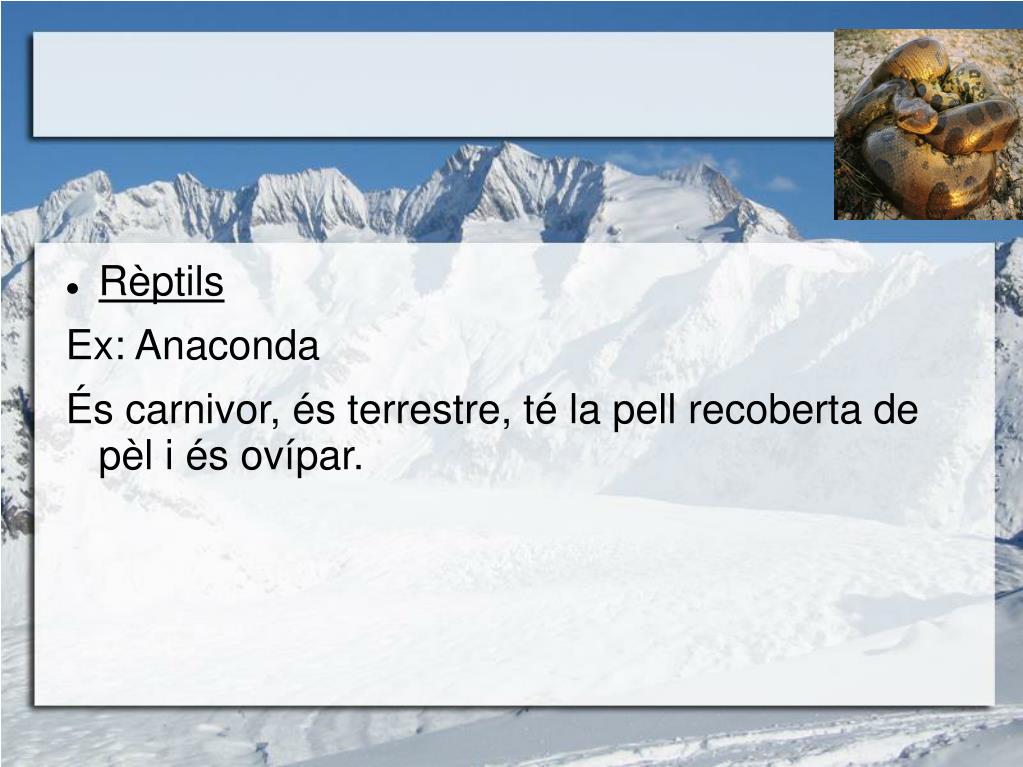 Rèptils Ex: Anaconda És carnivor, és terrestre, té la pell recoberta de pèl i és ovípar.