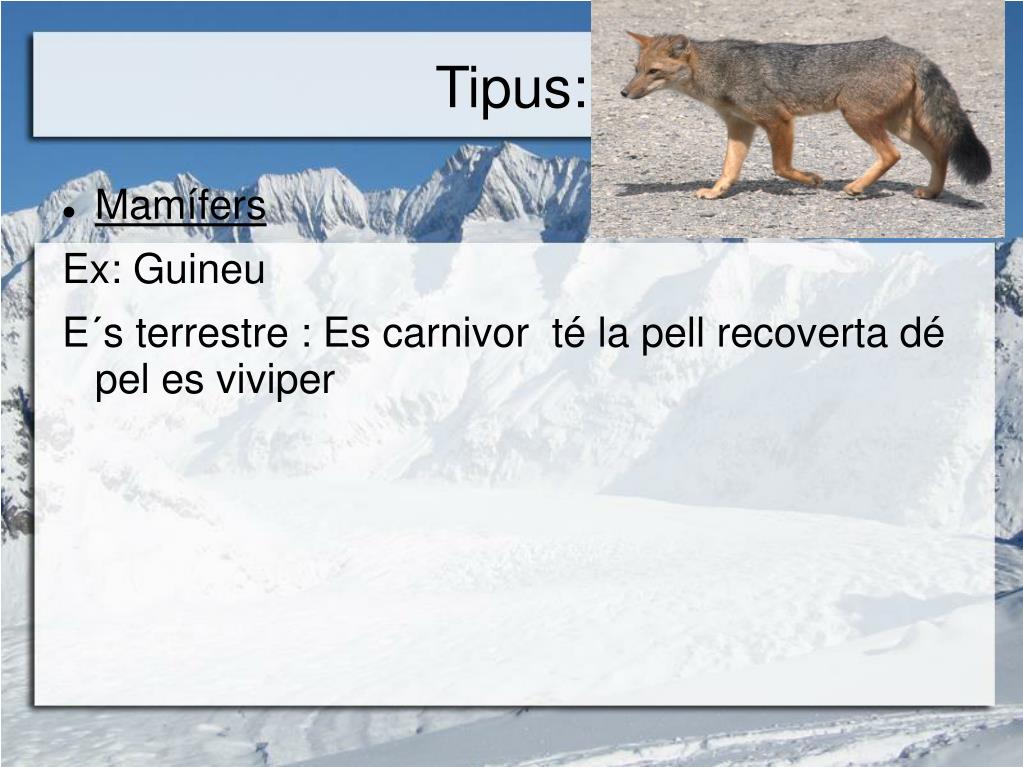 Tipus: • Mamífers Ex: Guineu E´s terrestre : Es carnivor té la pell recoverta dé pel es viviper