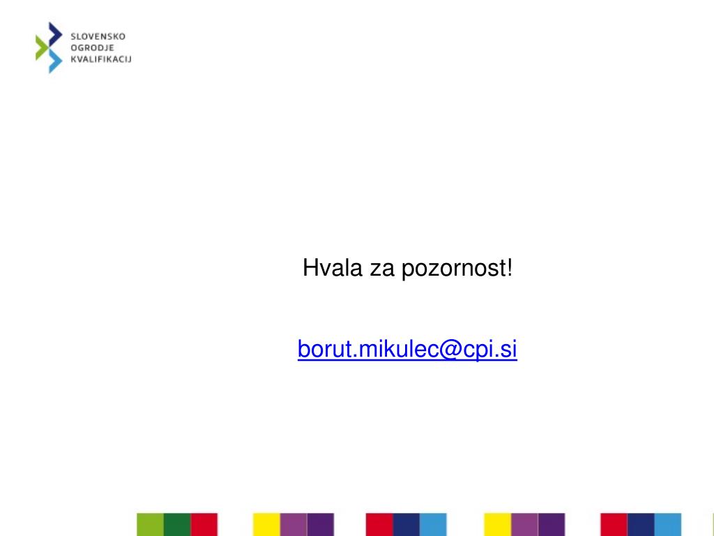 Kako naprej? Zagotoviti opise vseh kvalifikacij v RS skladno z metodologijo SOK v spletnem registru kvalifikacij SOK (sofinanciranje EK in MIZŠ) Prihodnji izzivi SOK: „zagotoviti zadostna sistemska sredstva in infrastrukturne pogoje za nadaljnji razvoj registra SOK“ Register kvalifikacij SOK – nacionalni register kvalifikacij v Sloveniji?