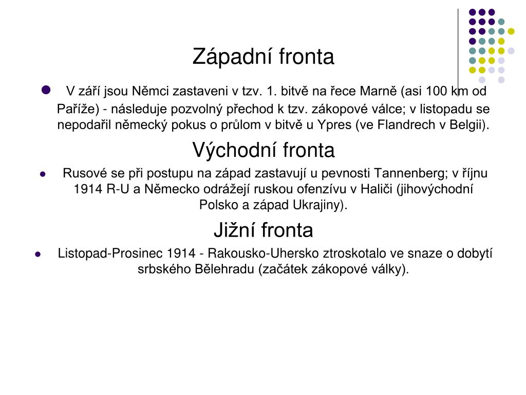 Západní fronta • V září jsou Němci zastaveni v tzv. 1. bitvě na řece Marně (asi 100 km od Paříže) - následuje pozvolný přechod k tzv. zákopové válce; v listopadu se nepodařil německý pokus o průlom v bitvě u Ypres (ve Flandrech v Belgii). Východní fronta • Rusové se při postupu na západ zastavují u pevnosti Tannenberg; v říjnu 1914 R-U a Německo odrážejí ruskou ofenzívu v Haliči (jihovýchodní Polsko a západ Ukrajiny). Jižní fronta • Listopad-Prosinec 1914 - Rakousko-Uhersko ztroskotalo ve snaze o dobytí srbského Bělehradu (začátek zákopové války).