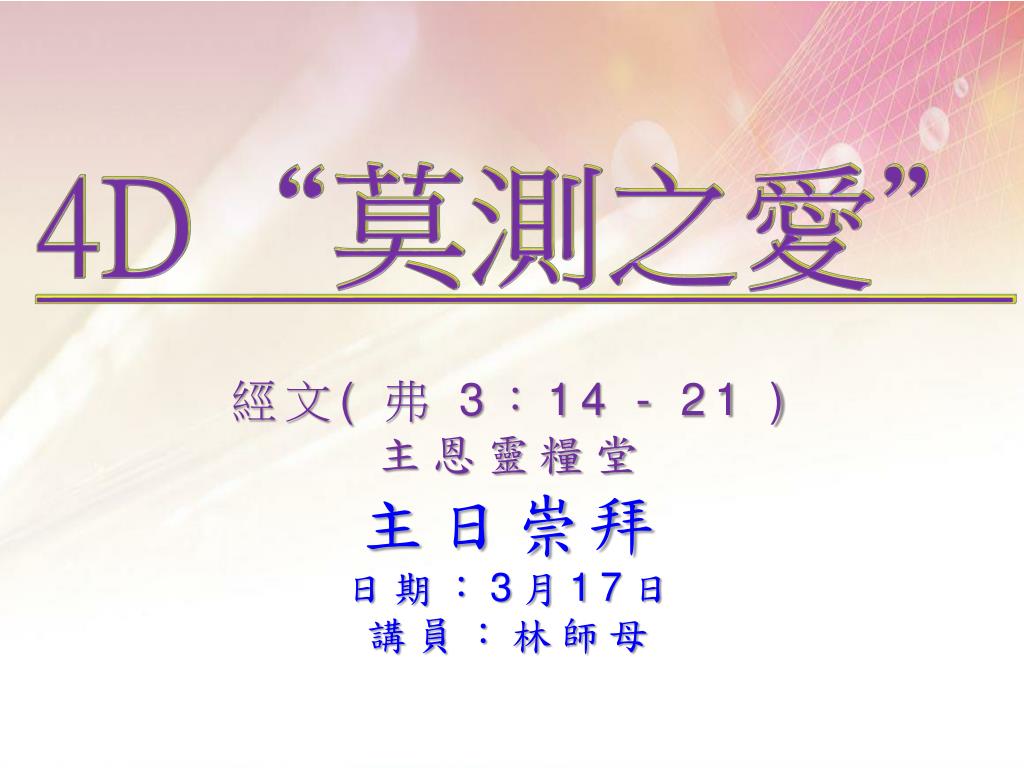 4D “ 莫測之愛 ”. 經文 ( 弗 3 : 14 - 21 ) 主恩靈糧堂 主日崇拜 日期: 3 月 17 日 講員:林師母. 因此 , 我 在父面前 屈膝天上 地上的各家都是從他得 名求 他按着他豐盛的 榮耀 , 藉 着他的 靈 , 使 你們心裏的力量剛強 起來 , 使 基督因着你們的信住在你們心 裏 , 叫 你們 的 愛心 有根有 基 ,. 能以和眾聖徒一同 明白 基督 的 愛 , 是 何等 的 長 闊 高深 , 並知道這愛是過於人所能測度 的 , 便 叫神一切所充滿的充滿了你們。