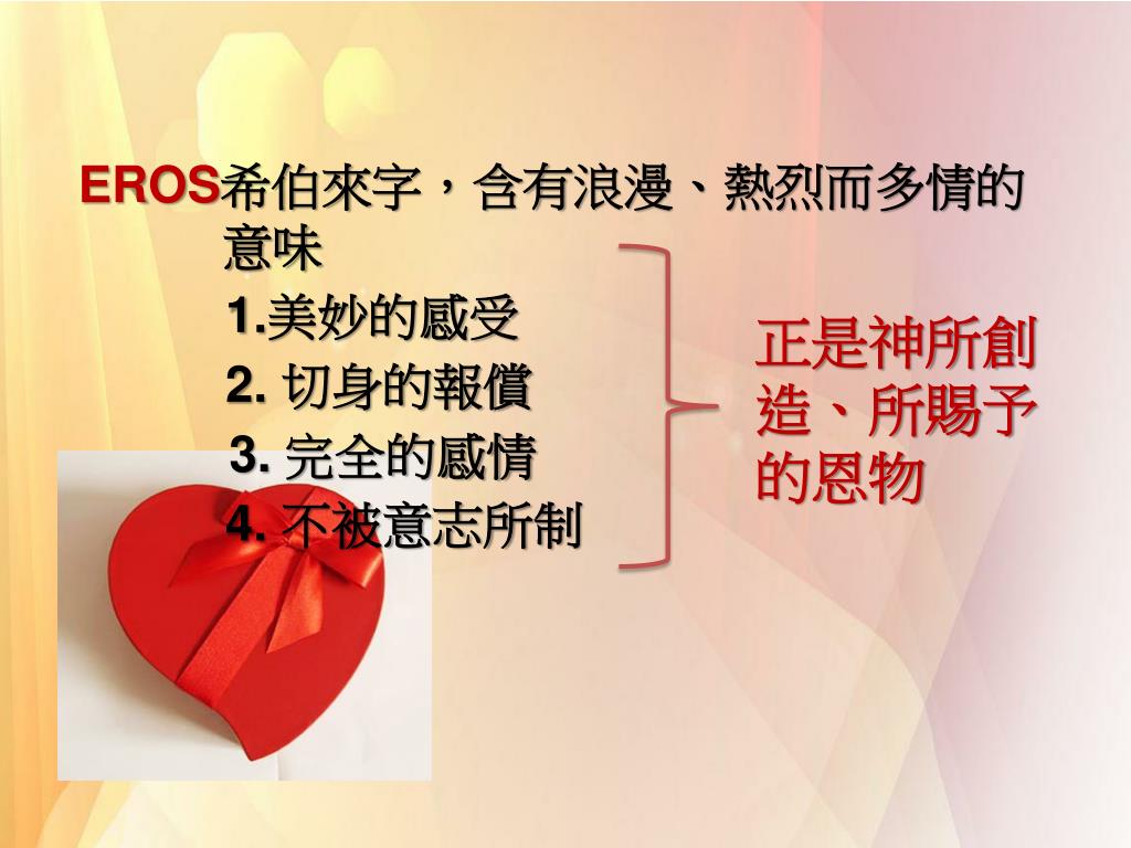 EROS希伯來字,含有浪漫、熱烈而多情的意味 1.美妙的感受 2. 切身的報償 3. 完全的感情 4. 不被意志所制 正是神所創造、所賜予的恩物