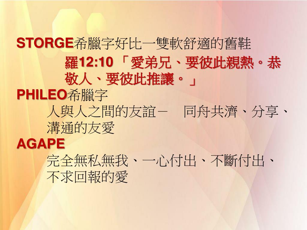 STORGE希臘字好比一雙軟舒適的舊鞋 羅12:10 「愛弟兄、要彼此親熱。恭敬人、要彼此推讓。」 PHILEO希臘字 人與人之間的友誼- 同舟共濟、分享、溝通的友愛 AGAPE 完全無私無我、一心付出、不斷付出、 不求回報的愛