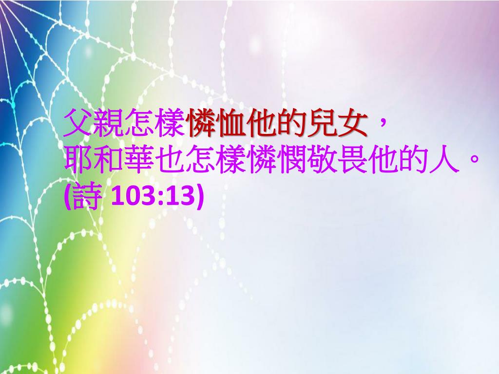 父親怎樣憐恤他的兒女, 耶和華也怎樣憐憫敬畏他的人。 (詩 103:13)