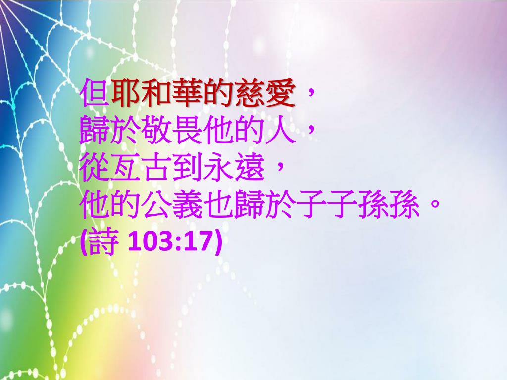 但耶和華的慈愛, 歸於敬畏他的人, 從亙古到永遠, 他的公義也歸於子子孫孫。 (詩 103:17)