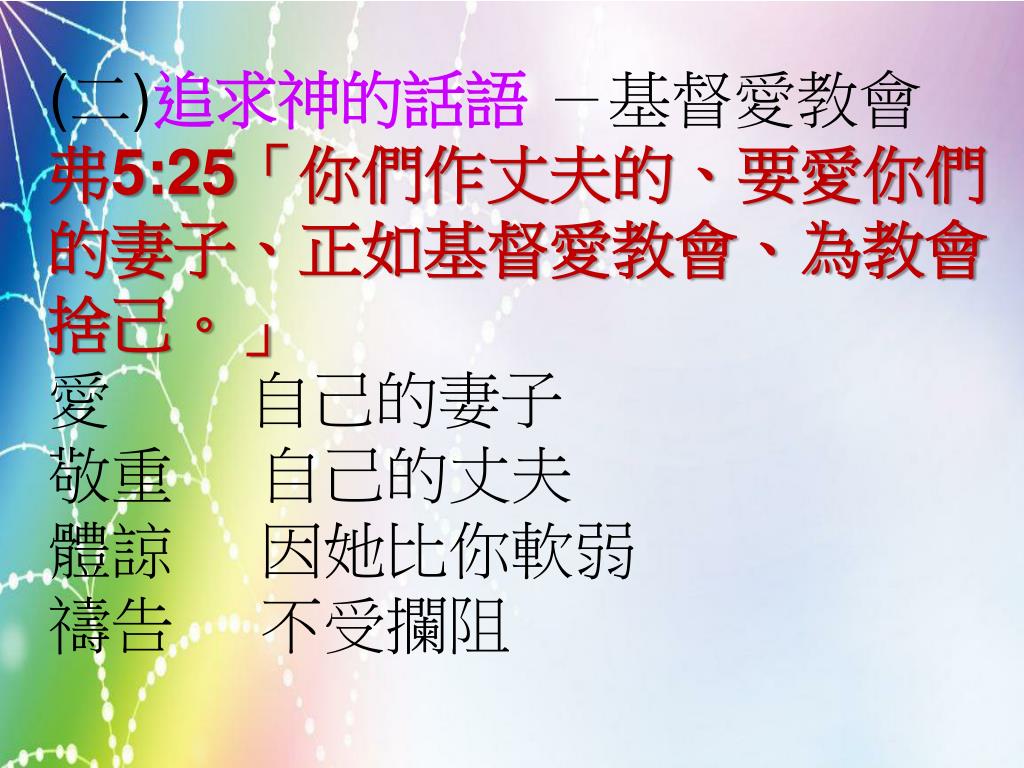 (二)追求神的話語 -基督愛教會 弗5:25「你們作丈夫的、要愛你們的妻子、正如基督愛教會、為教會捨己。」 愛 自己的妻子 敬重 自己的丈夫 體諒 因她比你軟弱 禱告 不受攔阻