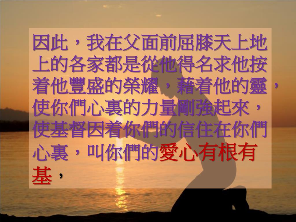 因此,我在父面前屈膝天上地上的各家都是從他得名求他按着他豐盛的榮耀,藉着他的靈,使你們心裏的力量剛強起來, 使基督因着你們的信住在你們心裏,叫你們的愛心有根有基,