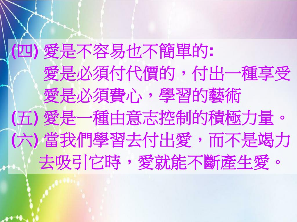 (四) 愛是不容易也不簡單的: 愛是必須付代價的,付出一種享受 愛是必須費心,學習的藝術 (五) 愛是一種由意志控制的積極力量。 (六) 當我們學習去付出愛,而不是竭力 去吸引它時,愛就能不斷產生愛。