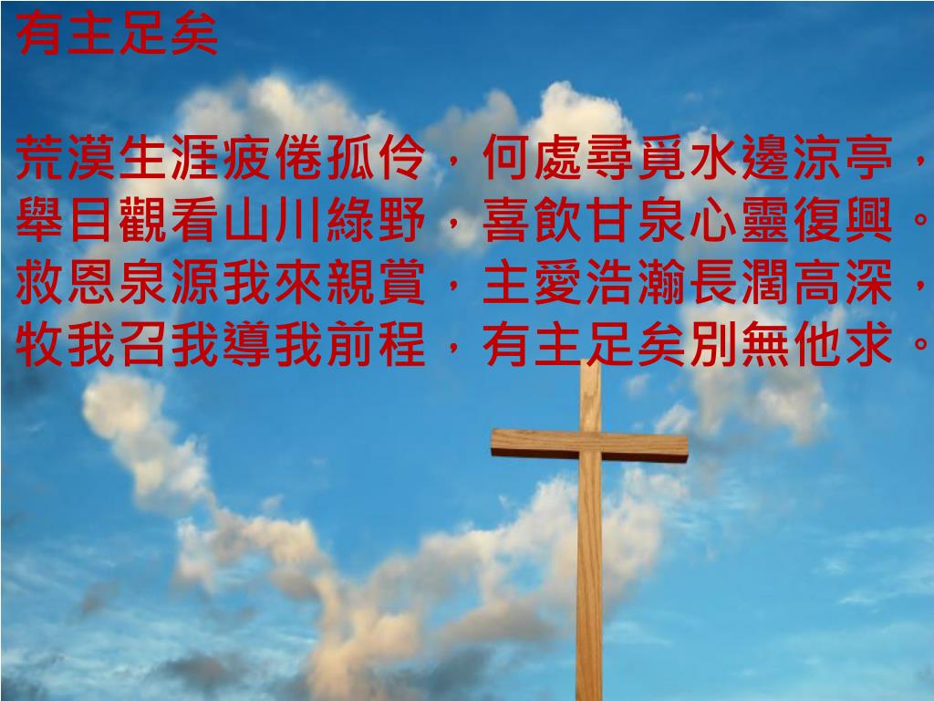 有主足矣 荒漠生涯疲倦孤伶,何處尋覓水邊涼亭, 舉目觀看山川綠野,喜飲甘泉心靈復興。 救恩泉源我來親賞,主愛浩瀚長濶高深, 牧我召我導我前程,有主足矣別無他求。