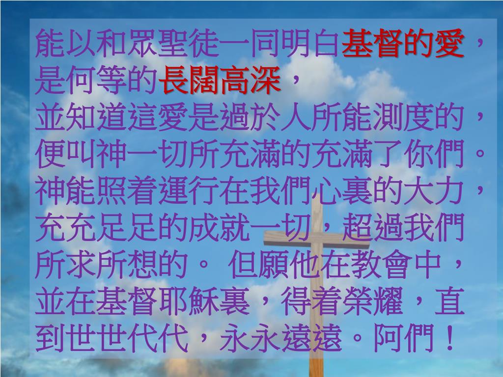 能以和眾聖徒一同明白基督的愛,是何等的長闊高深,能以和眾聖徒一同明白基督的愛,是何等的長闊高深, 並知道這愛是過於人所能測度的,便叫神一切所充滿的充滿了你們。 神能照着運行在我們心裏的大力,充充足足的成就一切,超過我們所求所想的。但願他在教會中,並在基督耶穌裏,得着榮耀,直到世世代代,永永遠遠。阿們!