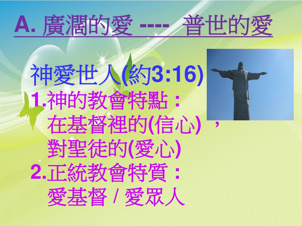 A. 廣濶的愛 ---- 普世的愛 神愛世人(約3:16) 1.神的教會特點 : 在基督裡的(信心) , 對聖徒的(愛心) 2.正統教會特質 : 愛基督 / 愛眾人