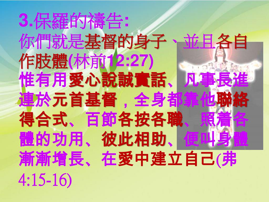 3.保羅的禱告: 你們就是基督的身子、並且各自作肢體(林前12:27) 惟有用愛心說誠實話、凡事長進連於元首基督,全身都靠他聯絡得合式、百節各按各職、照着各體的功用、彼此相助、便叫身體漸漸增長、在愛中建立自己(弗4:15-16)