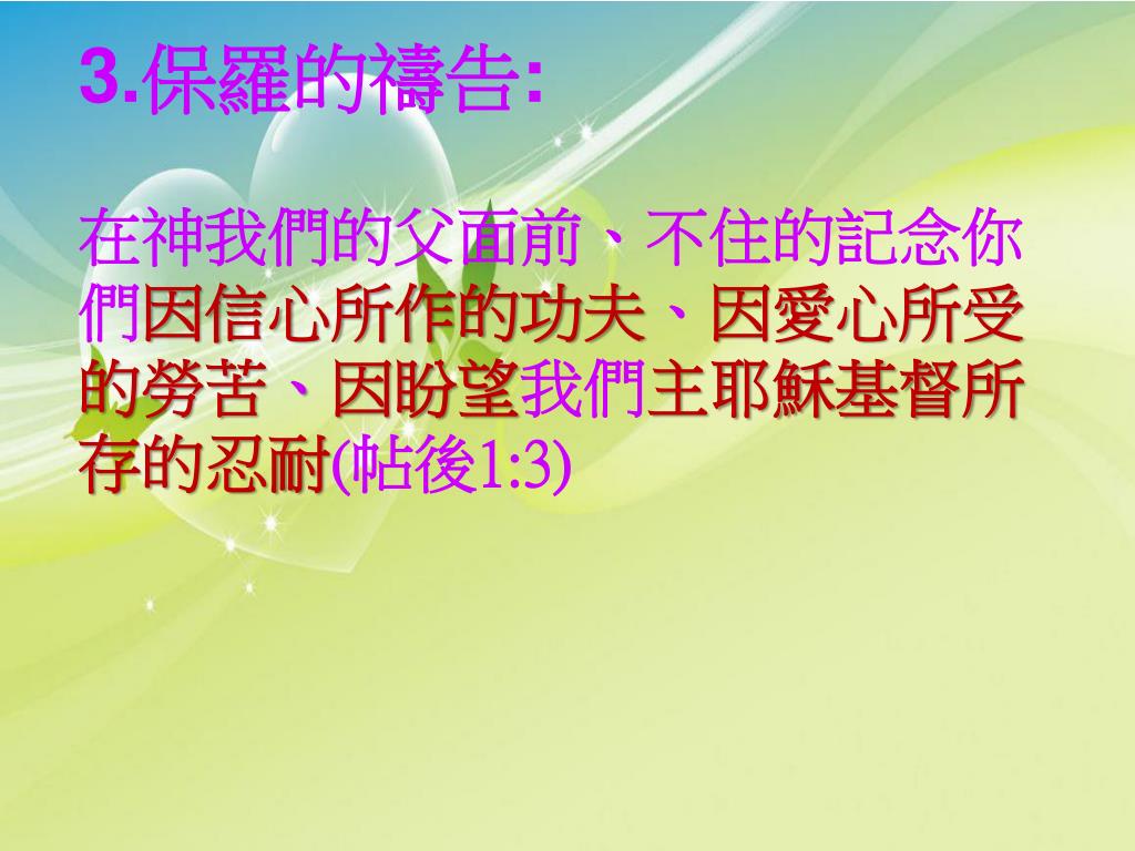 3.保羅的禱告: 在神我們的父面前、不住的記念你們因信心所作的功夫、因愛心所受的勞苦、因盼望我們主耶穌基督所存的忍耐(帖後1:3)