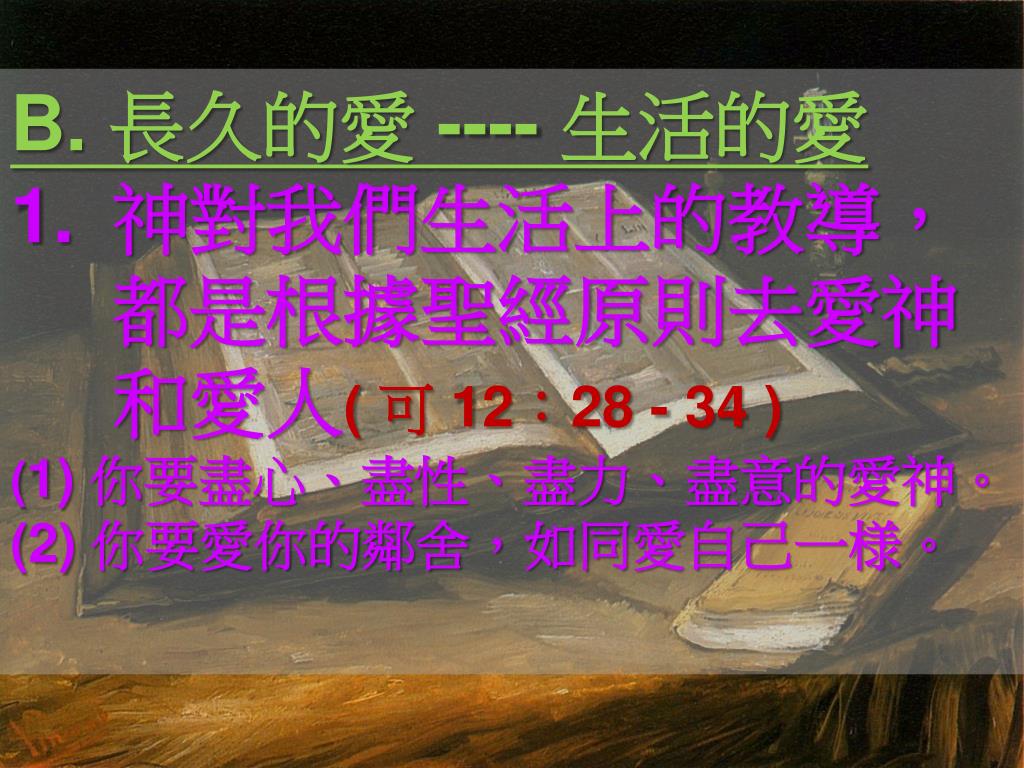B. 長久的愛 ---- 生活的愛 • 神對我們生活上的教導,都是根據聖經原則去愛神和愛人( 可 12:28 - 34 ) • (1) 你要盡心、盡性、盡力、盡意的愛神。 • (2) 你要愛你的鄰舍,如同愛自己一様。