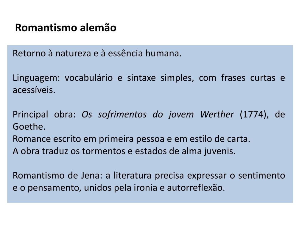 Romantismo alemão Retorno à natureza e à essência humana. Linguagem: vocabulário e sintaxe simples, com frases curtas e acessíveis. Principal obra: Os sofrimentos do jovem Werther (1774), de Goethe. Romance escrito em primeira pessoa e em estilo de carta. A obra traduz os tormentos e estados de alma juvenis. Romantismo de Jena: a literatura precisa expressar o sentimento e o pensamento, unidos pela ironia e autorreflexão.
