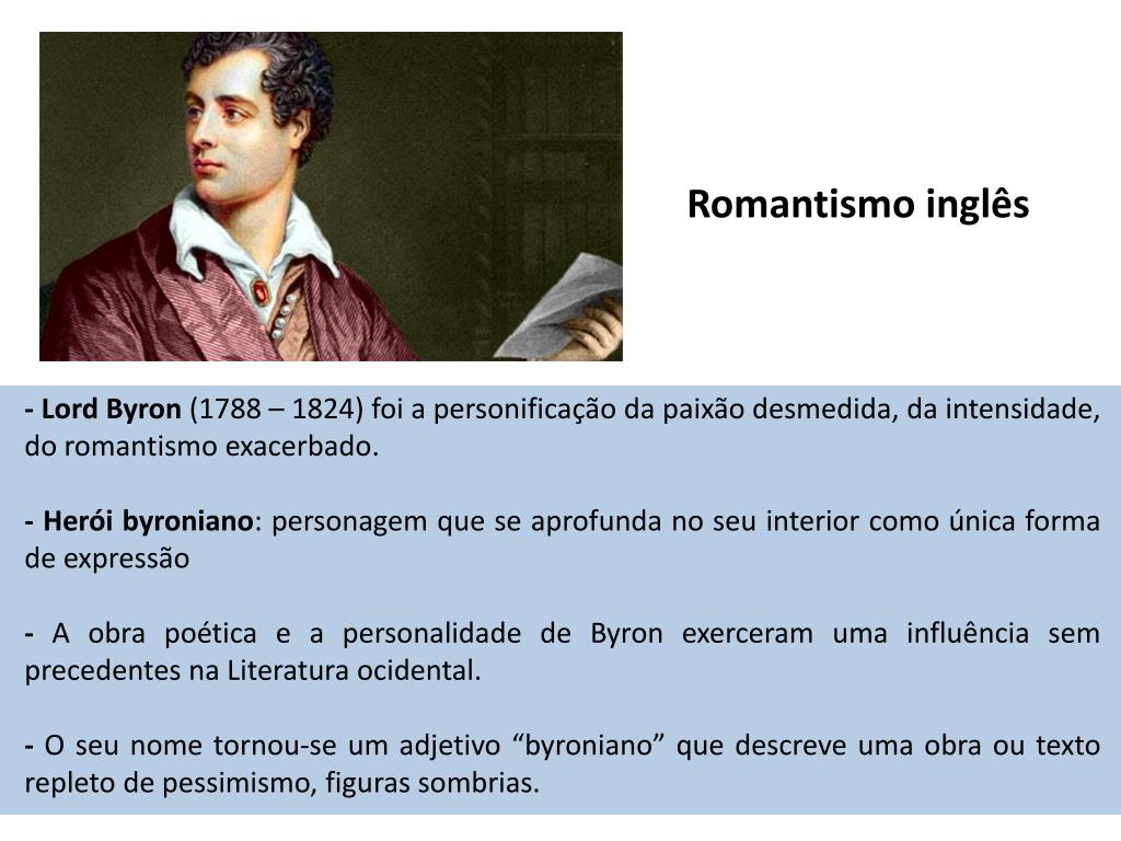 Romantismo inglês - Lord Byron (1788 – 1824) foi a personificação da paixão desmedida, da intensidade, do romantismo exacerbado. - Herói byroniano: personagem que se aprofunda no seu interior como única forma de expressão - A obra poética e a personalidade de Byron exerceram uma influência sem precedentes na Literatura ocidental. - O seu nome tornou-se um adjetivo “byroniano” que descreve uma obra ou texto repleto de pessimismo, figuras sombrias.