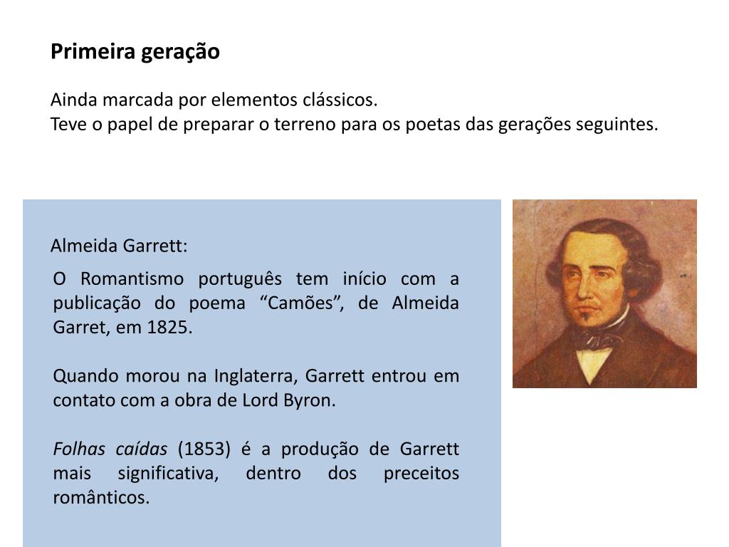 Primeira geração Ainda marcada por elementos clássicos. Teve o papel de preparar o terreno para os poetas das gerações seguintes. Almeida Garrett: O Romantismo português tem início com a publicação do poema “Camões”, de Almeida Garret, em 1825. Quando morou na Inglaterra, Garrett entrou em contato com a obra de Lord Byron. Folhas caídas (1853) é a produção de Garrett mais significativa, dentro dos preceitos românticos.