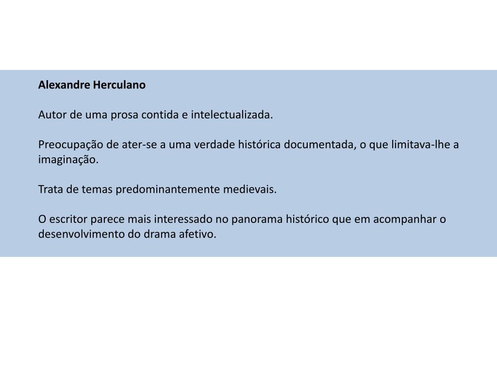 Alexandre Herculano Autor de uma prosa contida e intelectualizada. Preocupação de ater-se a uma verdade histórica documentada, o que limitava-lhe a imaginação. Trata de temas predominantemente medievais. O escritor parece mais interessado no panorama histórico que em acompanhar o desenvolvimento do drama afetivo.