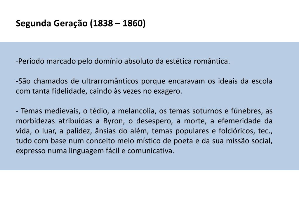 Segunda Geração (1838 – 1860) -Período marcado pelo domínio absoluto da estética romântica. -São chamados de ultrarromânticos porque encaravam os ideais da escola com tanta fidelidade, caindo às vezes no exagero. - Temas medievais, o tédio, a melancolia, os temas soturnos e fúnebres, as morbidezas atribuídas a Byron, o desespero, a morte, a efemeridade da vida, o luar, a palidez, ânsias do além, temas populares e folclóricos, tec., tudo com base num conceito meio místico de poeta e da sua missão social, expresso numa linguagem fácil e comunicativa.