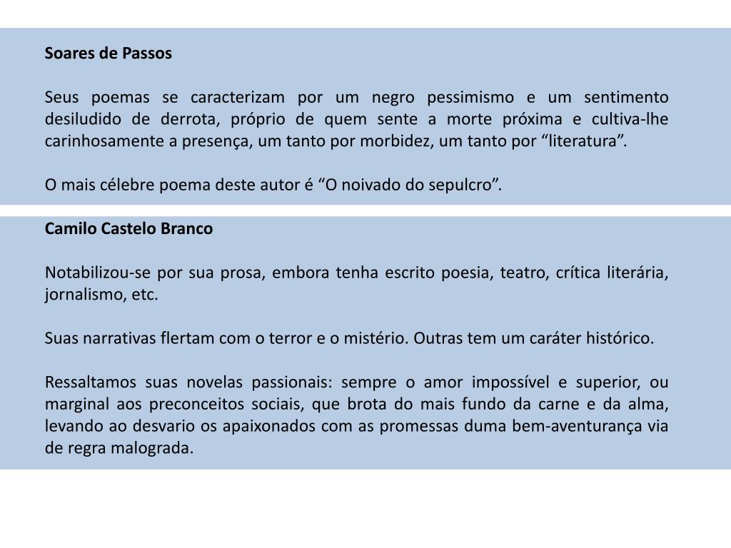 Soares de Passos Seus poemas se caracterizam por um negro pessimismo e um sentimento desiludido de derrota, próprio de quem sente a morte próxima e cultiva-lhe carinhosamente a presença, um tanto por morbidez, um tanto por “literatura”. O mais célebre poema deste autor é “O noivado do sepulcro”. Camilo Castelo Branco Notabilizou-se por sua prosa, embora tenha escrito poesia, teatro, crítica literária, jornalismo, etc. Suas narrativas flertam com o terror e o mistério. Outras tem um caráter histórico. Ressaltamos suas novelas passionais: sempre o amor impossível e superior, ou marginal aos preconceitos sociais, que brota do mais fundo da carne e da alma, levando ao desvario os apaixonados com as promessas duma bem-aventurança via de regra malograda.