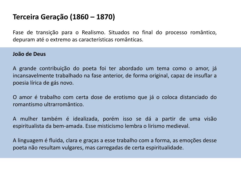 Terceira Geração (1860 – 1870) Fase de transição para o Realismo. Situados no final do processo romântico, depuram até o extremo as características românticas. João de Deus A grande contribuição do poeta foi ter abordado um tema como o amor, já incansavelmente trabalhado na fase anterior, de forma original, capaz de insuflar a poesia lírica de gás novo. O amor é trabalho com certa dose de erotismo que já o coloca distanciado do romantismo ultrarromântico. A mulher também é idealizada, porém isso se dá a partir de uma visão espiritualista da bem-amada. Esse misticismo lembra o lirismo medieval. A linguagem é fluida, clara e graças a esse trabalho com a forma, as emoções desse poeta não resultam vulgares, mas carregadas de certa espiritualidade.
