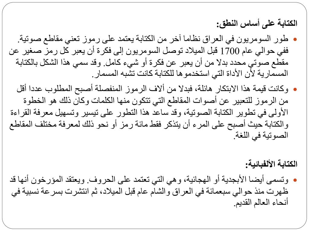 الكتابة على أساس النطق: • طور السومريون في العراق نظاما آخر من الكتابة يعتمد على رموز تعني مقاطع صوتية. ففي حوالي عام 1700 قبل الميلاد توصل السومريون إلى فكرة أن يعبر كل رمز صغير عن مقطع صوتي محدد بدلا من أن يعبر عن فكرة أو شيء كامل. وقد سمي هذا الشكل بالكتابة المسمارية لأن الأداة التي استخدموها للكتابة كانت تشبه المسمار. • وكانت قيمة هذا الابتكار هائلة، فبدلا من ألاف الرموز المنفصلة أصبح المطلوب عددا أقل من الرموز للتعبير عن أصوات المقاطع التي تتكون منها الكلمات وكان ذلك هو الخطوة الأولى في تطوير الكتابة الصوتية، وقد ساعد هذا التطور على تيسير وتسهيل معرفة القراءة والكتابة حيث أصبح على المرء أن يتذكر فقط مائة رمز أو نحو ذلك لمعرفة مختلف المقاطع الصوتية في اللغة. الكتابة الألفبائية: • وتسمى أيضا الأبجدية أو الهجائية، وهي التي تعتمد على الحروف. ويعتقد المؤرخون أنها قد ظهرت منذ حوالي سبعمائة في العراق والشام عام قبل الميلاد، ثم انتشرت بسرعة نسبية في أنحاء العالم القديم.