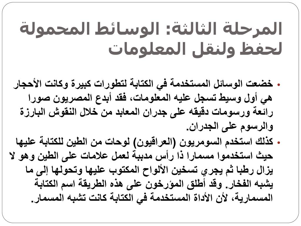 المرحلة الثالثة: الوسائط المحمولة لحفظ ولنقل المعلومات • خضعت الوسائل المستخدمة في الكتابة لتطورات كبيرة وكانت الأحجار هي أول وسيط تسجل عليه المعلومات، فقد أبدع المصريون صورا رائعة ورسومات دقيقه على جدران المعابد من خلال النقوش البارزة والرسوم على الجدران. • كذلك استخدم السومريون (العراقيون) لوحات من الطين للكتابة عليها حيث استخدموا مسمارا ذا رأس مدببة لعمل علامات على الطين وهو لا يزال رطبا ثم يجري تسخين الألواح المكتوب عليها وتحولها إلى ما يشبه الفخار. وقد أطلق المؤرخون على هذه الطريقة اسم الكتابة المسمارية، لأن الأداة المستخدمة في الكتابة كانت تشبه المسمار.