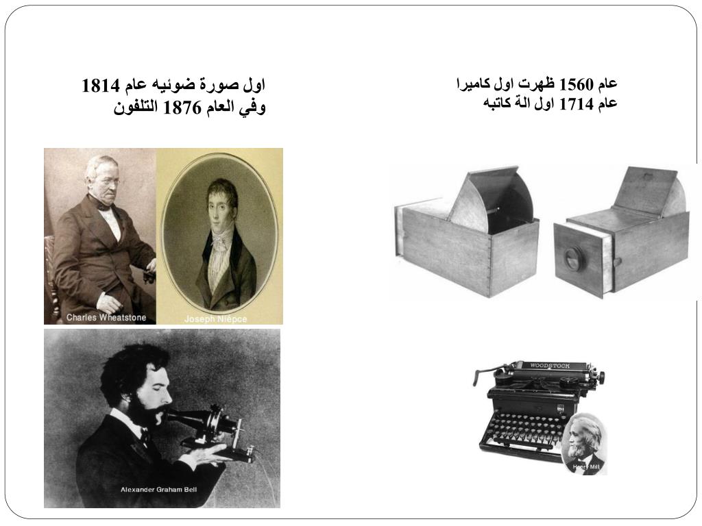 اول صورة ضوئيه عام 1814 وفي العام 1876 التلفون عام 1560 ظهرت اول كاميرا عام 1714 اول الة كاتبه