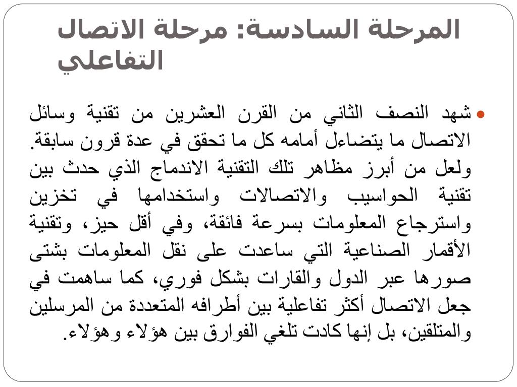 المرحلة السادسة: مرحلة الاتصال التفاعلي • شهد النصف الثاني من القرن العشرين من تقنية وسائل الاتصال ما يتضاءل أمامه كل ما تحقق في عدة قرون سابقة. ولعل من أبرز مظاهر تلك التقنية الاندماج الذي حدث بين تقنية الحواسيب والاتصالات واستخدامها في تخزين واسترجاع المعلومات بسرعة فائقة، وفي أقل حيز، وتقنية الأقمار الصناعية التي ساعدت على نقل المعلومات بشتى صورها عبر الدول والقارات بشكل فوري، كما ساهمت في جعل الاتصال أكثر تفاعلية بين أطرافه المتعددة من المرسلين والمتلقين، بل إنها كادت تلغي الفوارق بين هؤلاء وهؤلاء.