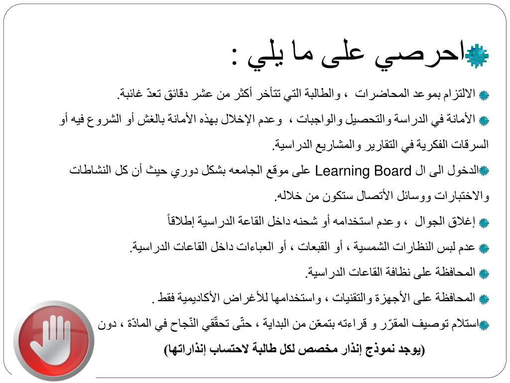 احرصي على ما يلي : الالتزام بموعد المحاضرات ، والطالبة التي تتأخر أكثر من عشر دقائق تعدّ غائبة. الأمانة في الدراسة والتحصيل والواجبات ، وعدم الإخلال بهذه الأمانة بالغش أو الشروع فيه أو السرقات الفكرية في التقارير والمشاريع الدراسية. الدخول الىالLearning Board على موقع الجامعه بشكل دوري حيث أن كل النشاطات والاختبارات ووسائل الأتصال ستكون من خلاله. إغلاق الجوال ، وعدم استخدامه أو شحنه داخل القاعة الدراسية إطلاقاً عدم لبس النظارات الشمسية ، أو القبعات ، أو العباءات داخل القاعات الدراسية. المحافظة على نظافة القاعات الدراسية. المحافظة على الأجهزة والتقنيات ، واستخدامها للأغراض الأكاديمية فقط . استلام توصيف المقرّر و قراءته بتمعّن من البداية ، حتّى تحقّقي النّجاح في المادّة ، دون تعثّر . (يوجد نموذج إنذار مخصص لكل طالبة لاحتساب إنذاراتها)