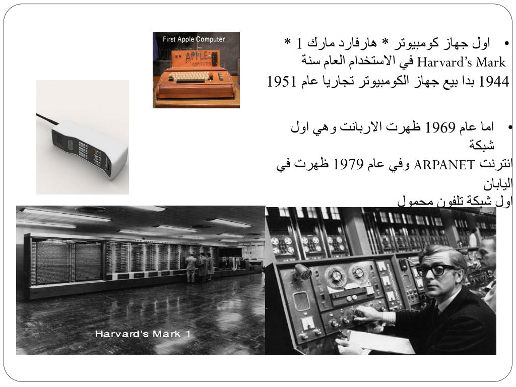 اول جهاز كومبيوتر * هارفارد مارك 1 * • Harvard’s Mark في الاستخدام العام سنة • 1944 بدا بيع جهاز الكومبيوتر تجاريا عام 1951 • اما عام 1969 ظهرت الاربانت وهي اول شبكة • انترنت ARPANET وفي عام 1979 ظهرت في اليابان • اول شبكة تلفون محمول
