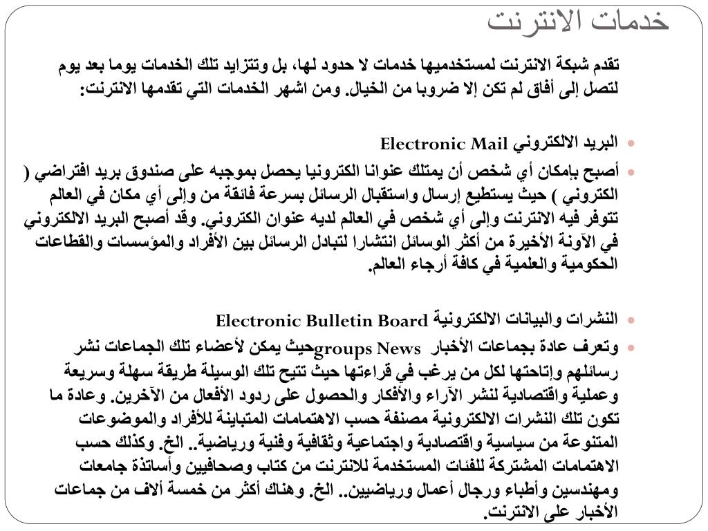 خدمات الانترنت تقدم شبكة الانترنت لمستخدميها خدمات لا حدود لها، بل وتتزايد تلك الخدمات يوما بعد يوم لتصل إلى أفاق لم تكن إلا ضروبا من الخيال. ومن اشهر الخدمات التي تقدمها الانترنت: • البريد الالكتروني Electronic Mail • أصبح بإمكان أي شخص أن يمتلك عنوانا الكترونيا يحصل بموجبه على صندوق بريد افتراضي ( الكتروني ) حيث يستطيع إرسال واستقبال الرسائل بسرعة فائقة من وإلى أي مكان في العالم تتوفر فيه الانترنت وإلى أي شخص في العالم لديه عنوان الكتروني. وقد أصبح البريد الالكتروني في الآونة الأخيرة من أكثر الوسائل انتشارا لتبادل الرسائل بين الأفراد والمؤسسات والقطاعات الحكومية والعلمية في كافة أرجاء العالم. • النشرات والبيانات الالكترونية Electronic Bulletin Board • وتعرف عادة بجماعات الأخبار groups News حيث يمكن لأعضاء تلك الجماعات نشر رسائلهم وإتاحتها لكل من يرغب في قراءتها حيث تتيح تلك الوسيلة طريقة سهلة وسريعة وعملية واقتصادية لنشر الآراء والأفكار والحصول على ردود الأفعال من الآخرين. وعادة ما تكون تلك النشرات الالكترونية مصنفة حسب الاهتمامات المتباينة للأفراد والموضوعات المتنوعة من سياسية واقتصادية واجتماعية وثقافية وفنية ورياضية.. الخ. وكذلك حسب الاهتمامات المشتركة للفئات المستخدمة للانترنت من كتاب وصحافيين وأساتذة جامعات ومهندسين وأطباء ورجال أعمال ورياضيين.. الخ. وهناك أكثر من خمسة ألاف من جماعات الأخبار على الانترنت.