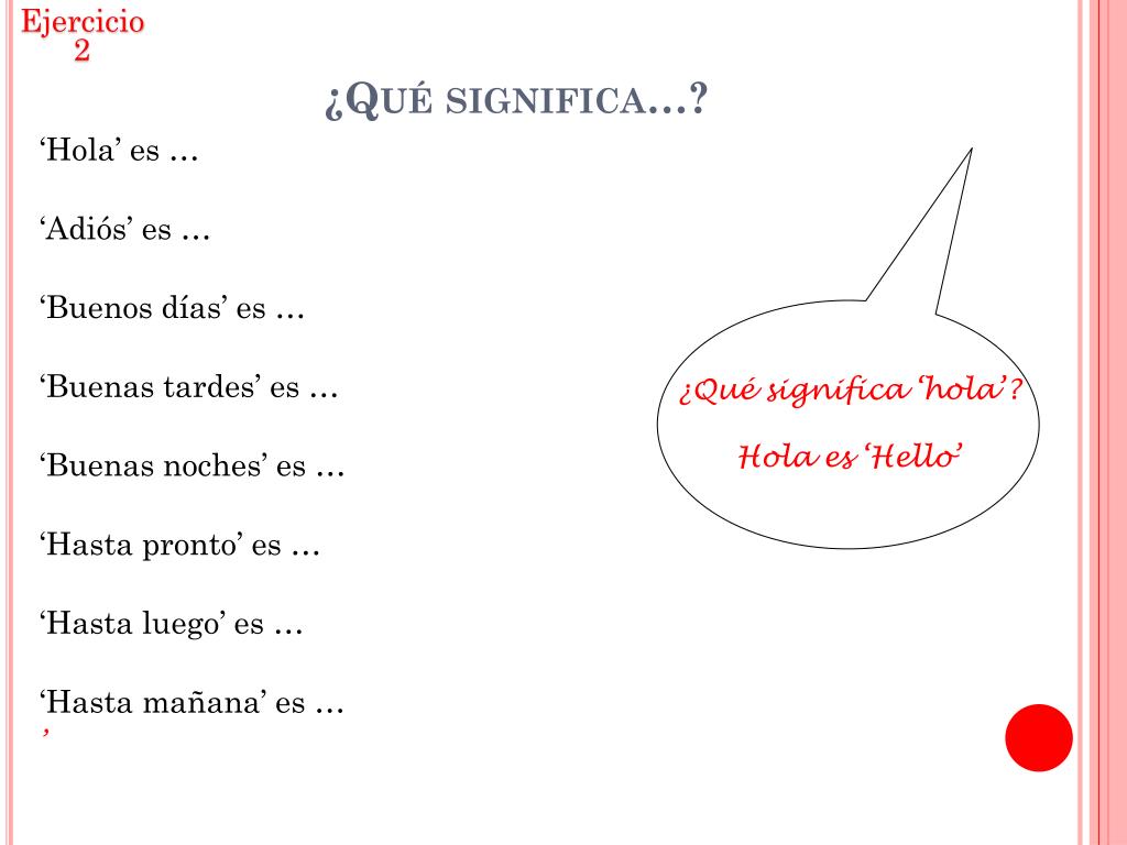 Ejercicio 2 ¿Qué significa…? ‘Hola’ es … ‘Adiós’ es … ‘Buenos días’ es … ‘Buenas tardes’ es … ‘Buenas noches’ es … ‘Hasta pronto’ es … ‘Hasta luego’ es … ‘Hasta mañana’ es … ’ ¿Qué significa ‘hola’? Hola es ‘Hello’