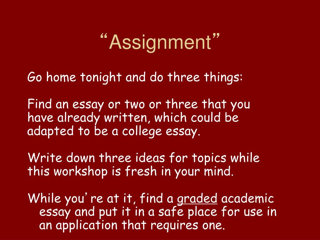 “Assignment” Go home tonight and do three things: Find an essay or two or three that you have already written, which could be adapted to be a college essay. Write down three ideas for topics while this workshop is fresh in your mind. While you’re at it, find a graded academic essay and put it in a safe place for use in an application that requires one.