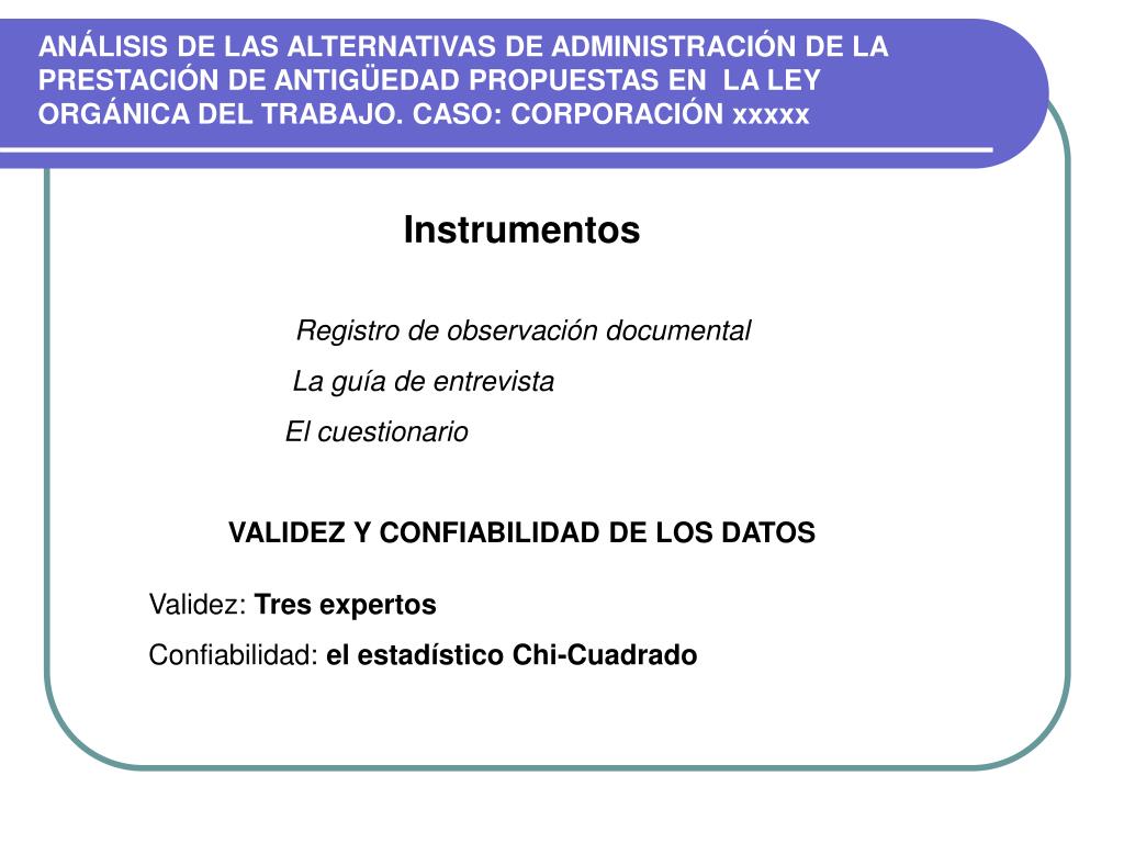 ANÁLISIS DE LAS ALTERNATIVAS DE ADMINISTRACIÓN DE LA PRESTACIÓN DE ANTIGÜEDAD PROPUESTAS EN LA LEY ORGÁNICA DEL TRABAJO. CASO: CORPORACIÓN xxxxx Instrumentos Registro de observación documental La guía de entrevista El cuestionario VALIDEZ Y CONFIABILIDAD DE LOS DATOS Validez: Tres expertos Confiabilidad: el estadístico Chi-Cuadrado