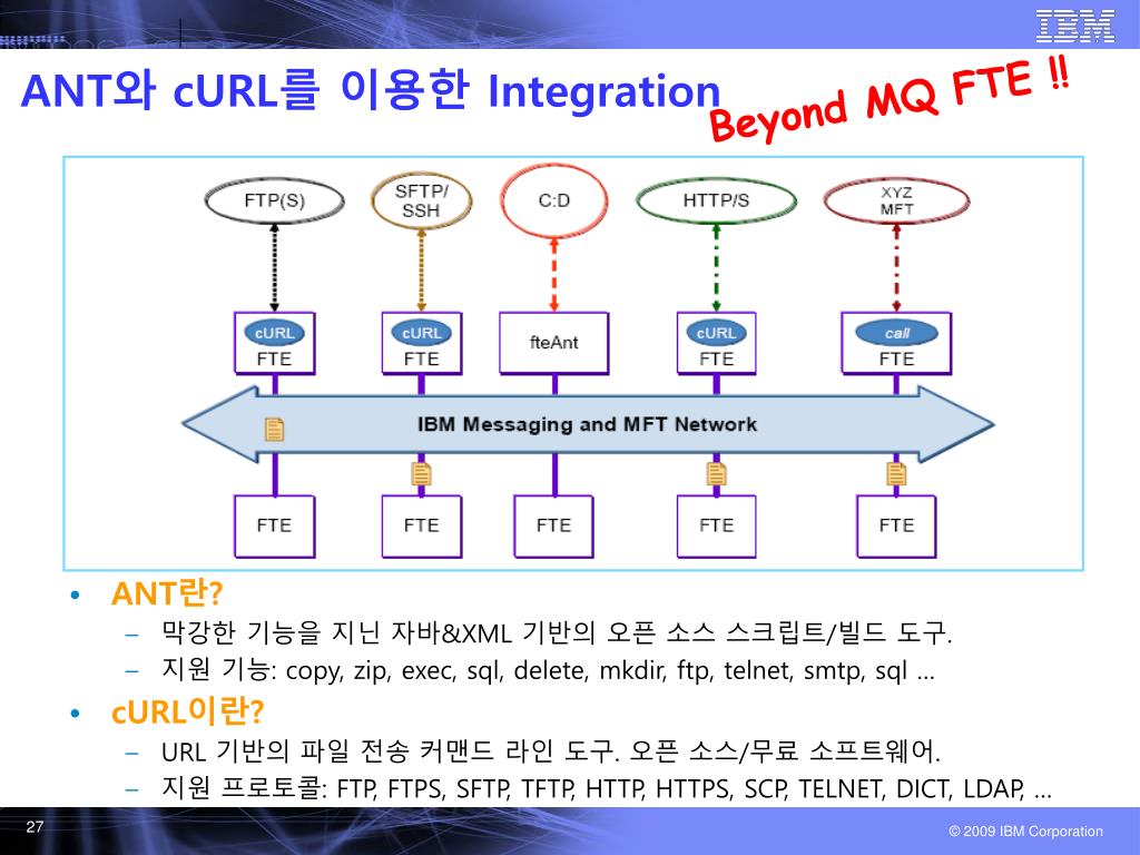 ANT와 cURL를 이용한 Integration Beyond MQ FTE !! • ANT란? • 막강한 기능을 지닌 자바&XML 기반의 오픈 소스 스크립트/빌드 도구. • 지원 기능: copy, zip, exec, sql, delete, mkdir, ftp, telnet, smtp, sql … • cURL이란? • URL 기반의 파일 전송 커맨드 라인 도구. 오픈 소스/무료 소프트웨어. • 지원 프로토콜: FTP, FTPS, SFTP, TFTP, HTTP, HTTPS, SCP, TELNET, DICT, LDAP, …