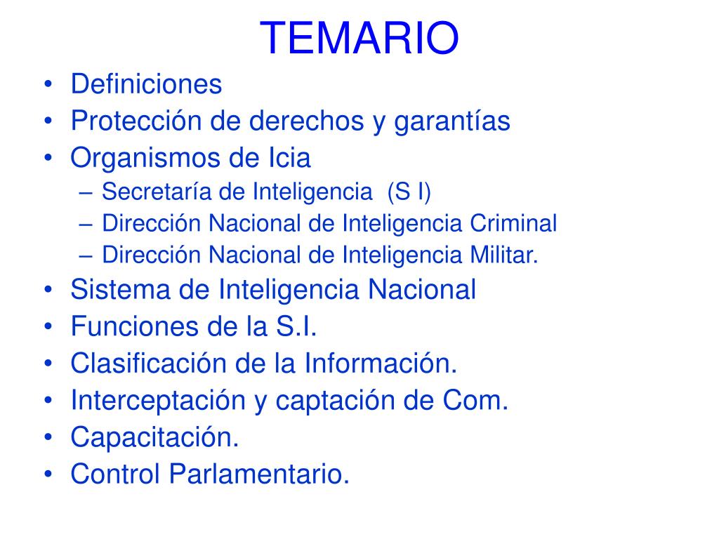 TEMARIO • Definiciones • Protección de derechos y garantías • Organismos de Icia • Secretaría de Inteligencia (S I) • Dirección Nacional de Inteligencia Criminal • Dirección Nacional de Inteligencia Militar. • Sistema de Inteligencia Nacional • Funciones de la S.I. • Clasificación de la Información. • Interceptación y captación de Com. • Capacitación. • Control Parlamentario.