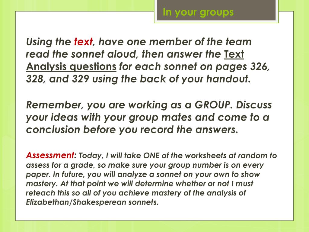 In your groups Using the text, have one member of the team read the sonnet aloud, then answer the Text Analysis questions for each sonnet on pages 326, 328, and 329 using the back of your handout. Remember, you are working as a GROUP. Discuss your ideas with your group mates and come to a conclusion before you record the answers. Assessment: Today, I will take ONE of the worksheets at random to assess for a grade, so make sure your group number is on every paper. In future, you will analyze a sonnet on your own to show mastery. At that point we will determine whether or not I must reteach this so all of you achieve mastery of the analysis of Elizabethan/Shakesperean sonnets.