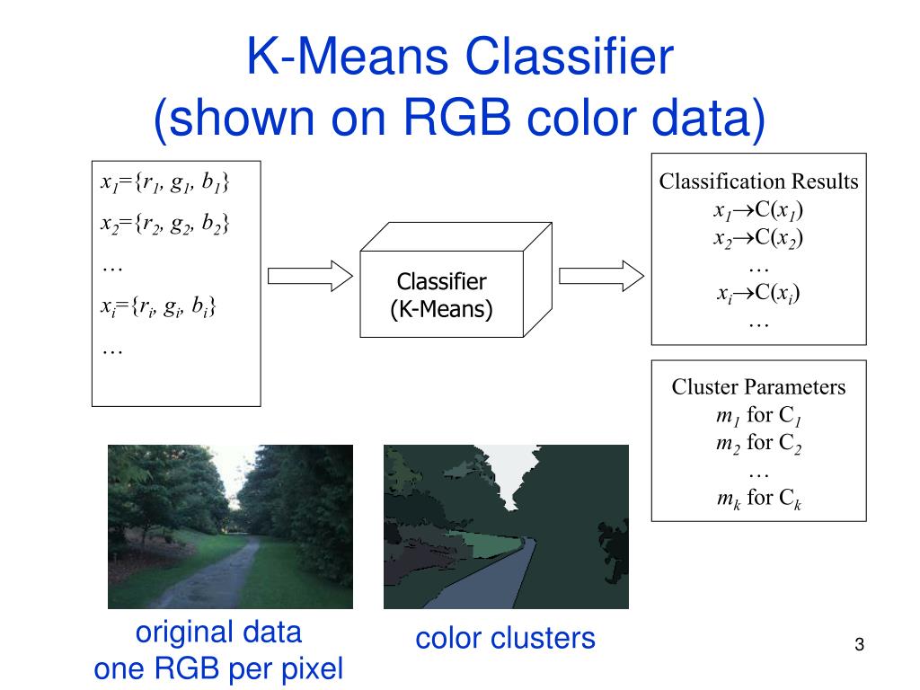 x1={r1, g1, b1} x2={r2, g2, b2} … xi={ri, gi, bi} … K-Means Classifier(shown on RGB color data) Classification Results x1C(x1) x2C(x2) … xiC(xi) … Classifier (K-Means) Cluster Parameters m1 for C1 m2 for C2 … mk for Ck original data one RGB per pixel color clusters