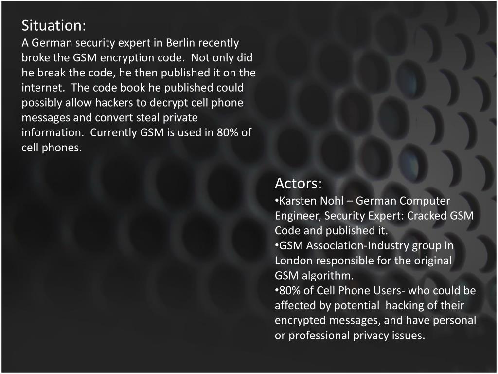 Situation: A German security expert in Berlin recently broke the GSM encryption code. Not only did he break the code, he then published it on the internet. The code book he published could possibly allow hackers to decrypt cell phone messages and convert steal private information. Currently GSM is used in 80% of cell phones. • Actors: • Karsten Nohl – German Computer Engineer, Security Expert: Cracked GSM Code and published it. • GSM Association-Industry group in London responsible for the original GSM algorithm. • 80% of Cell Phone Users- who could be affected by potential hacking of their encrypted messages, and have personal or professional privacy issues.