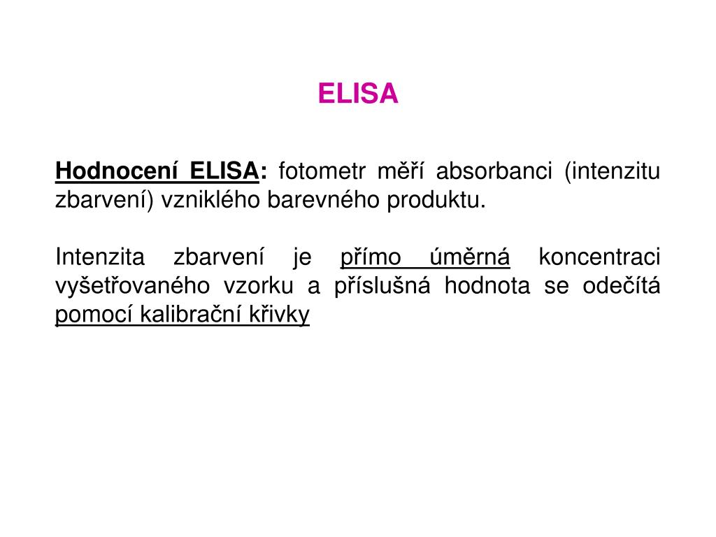 ELISA Hodnocení ELISA: fotometr měří absorbanci (intenzitu zbarvení) vzniklého barevného produktu. Intenzita zbarvení je přímo úměrná koncentraci vyšetřovaného vzorku a příslušná hodnota se odečítá pomocí kalibrační křivky