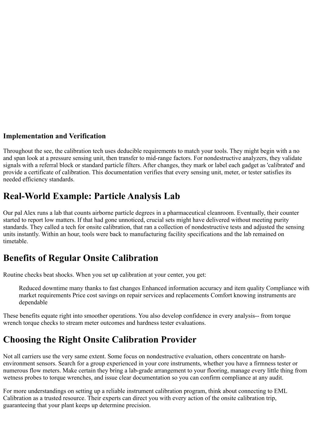 Implementation and Verification Throughout the see, the calibration tech uses deducible requirements to match your tools. They might begin with a no and span look at a pressure sensing unit, then transfer to mid-range factors. For nondestructive analyzers, they validate signals with a referral block or standard particle filters. After changes, they mark or label each gadget as 'calibrated' and provide a certificate of calibration. This documentation verifies that every sensing unit, meter, or tester satisfies its needed efficiency standards. Real-World Example: Particle Analysis Lab Our pal Alex runs a lab that counts airborne particle degrees in a pharmaceutical cleanroom. Eventually, their counter started to report low matters. If that had gone unnoticed, crucial sets might have delivered without meeting purity standards. They called a tech for onsite calibration, that ran a collection of nondestructive tests and adjusted the sensing units instantly. Within an hour, tools were back to manufacturing facility specifications and the lab remained on timetable. Benefits of Regular Onsite Calibration Routine checks beat shocks. When you set up calibration at your center, you get: Reduced downtime many thanks to fast changes Enhanced information accuracy and item quality Compliance with market requirements Price cost savings on repair services and replacements Comfort knowing instruments are dependable These benefits equate right into smoother operations. You also develop confidence in every analysis-- from torque wrench torque checks to stream meter outcomes and hardness tester evaluations. Choosing the Right Onsite Calibration Provider Not all carriers use the very same extent. Some focus on nondestructive evaluation, others concentrate on harsh- environment sensors. Search for a group experienced in your core instruments, whether you have a firmness tester or numerous flow meters. Make certain they bring a lab-grade arrangement to your flooring, manage every little thing from wetness probes to torque wrenches, and issue clear documentation so you can confirm compliance at any audit. For more understandings on setting up a reliable instrument calibration program, think about connecting to EML Calibration as a trusted resource. Their experts can direct you with every action of the onsite calibration trip, guaranteeing that your plant keeps up determine precision.