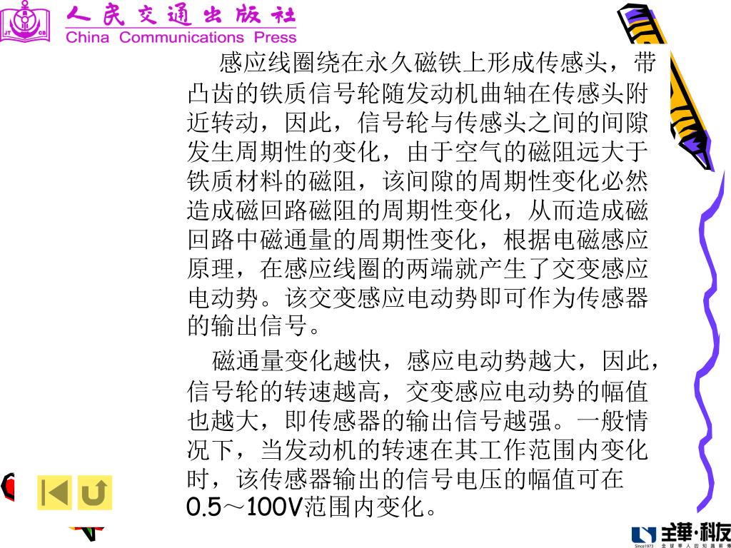 感应线圈绕在永久磁铁上形成传感头,带凸齿的铁质信号轮随发动机曲轴在传感头附近转动,因此,信号轮与传感头之间的间隙发生周期性的变化,由于空气的磁阻远大于铁质材料的磁阻,该间隙的周期性变化必然造成磁回路磁阻的周期性变化,从而造成磁回路中磁通量的周期性变化,根据电磁感应原理,在感应线圈的两端就产生了交变感应电动势。该交变感应电动势即可作为传感器的输出信号。感应线圈绕在永久磁铁上形成传感头,带凸齿的铁质信号轮随发动机曲轴在传感头附近转动,因此,信号轮与传感头之间的间隙发生周期性的变化,由于空气的磁阻远大于铁质材料的磁阻,该间隙的周期性变化必然造成磁回路磁阻的周期性变化,从而造成磁回路中磁通量的周期性变化,根据电磁感应原理,在感应线圈的两端就产生了交变感应电动势。该交变感应电动势即可作为传感器的输出信号。 • 磁通量变化越快,感应电动势越大,因此,信号轮的转速越高,交变感应电动势的幅值也越大,即传感器的输出信号越强。一般情况下,当发动机的转速在其工作范围内变化时,该传感器输出的信号电压的幅值可在0.5~100V范围内变化。