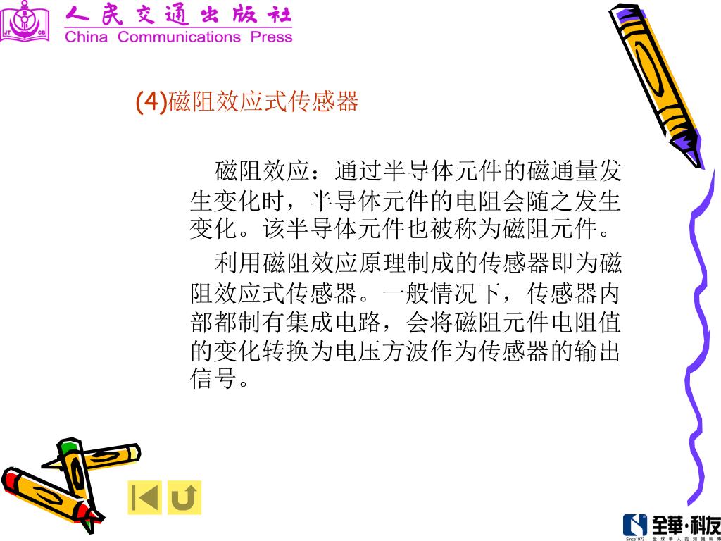 (4)磁阻效应式传感器 • 磁阻效应:通过半导体元件的磁通量发生变化时,半导体元件的电阻会随之发生变化。该半导体元件也被称为磁阻元件。 • 利用磁阻效应原理制成的传感器即为磁阻效应式传感器。一般情况下,传感器内部都制有集成电路,会将磁阻元件电阻值的变化转换为电压方波作为传感器的输出信号。