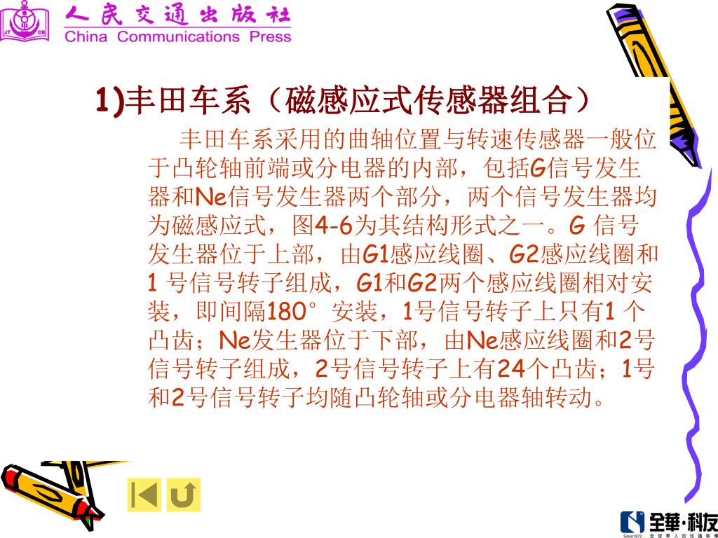 由上述情况可知,对于丰田车系而言,ECU依靠Ne信号来判断曲轴的转角与转速,依靠Ne信号与G1、G2信号的组合来判断各缸上止点的位置,因此,G信号被称为判缸信号,Ne信号被称为转速信号。由上述情况可知,对于丰田车系而言,ECU依靠Ne信号来判断曲轴的转角与转速,依靠Ne信号与G1、G2信号的组合来判断各缸上止点的位置,因此,G信号被称为判缸信号,Ne信号被称为转速信号。 • G1信号和G2信号中缺失一个,发动机仍然能够发动,但Ne信号一旦缺失,发动机将立即熄火,且不能发动。
