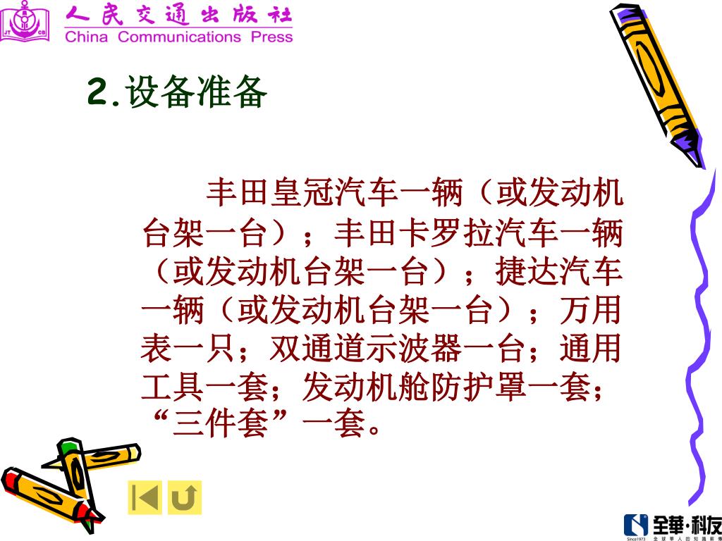 2.设备准备 • 丰田皇冠汽车一辆(或发动机台架一台);丰田卡罗拉汽车一辆(或发动机台架一台);捷达汽车一辆(或发动机台架一台);万用表一只;双通道示波器一台;通用工具一套;发动机舱防护罩一套;“三件套”一套。