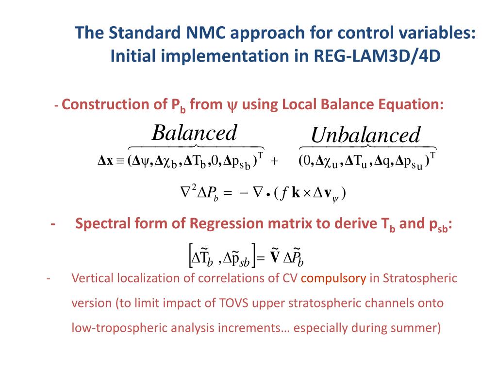 The Standard NMC approach for control variables:Initial implementation in REG-LAM3D/4D - Construction of Pb from y using Local Balance Equation: - Spectral form of Regression matrix to derive Tb and psb: • Vertical localization of correlations of CV compulsory in Stratospheric version (to limit impact of TOVS upper stratospheric channels onto low-tropospheric analysis increments… especially during summer)